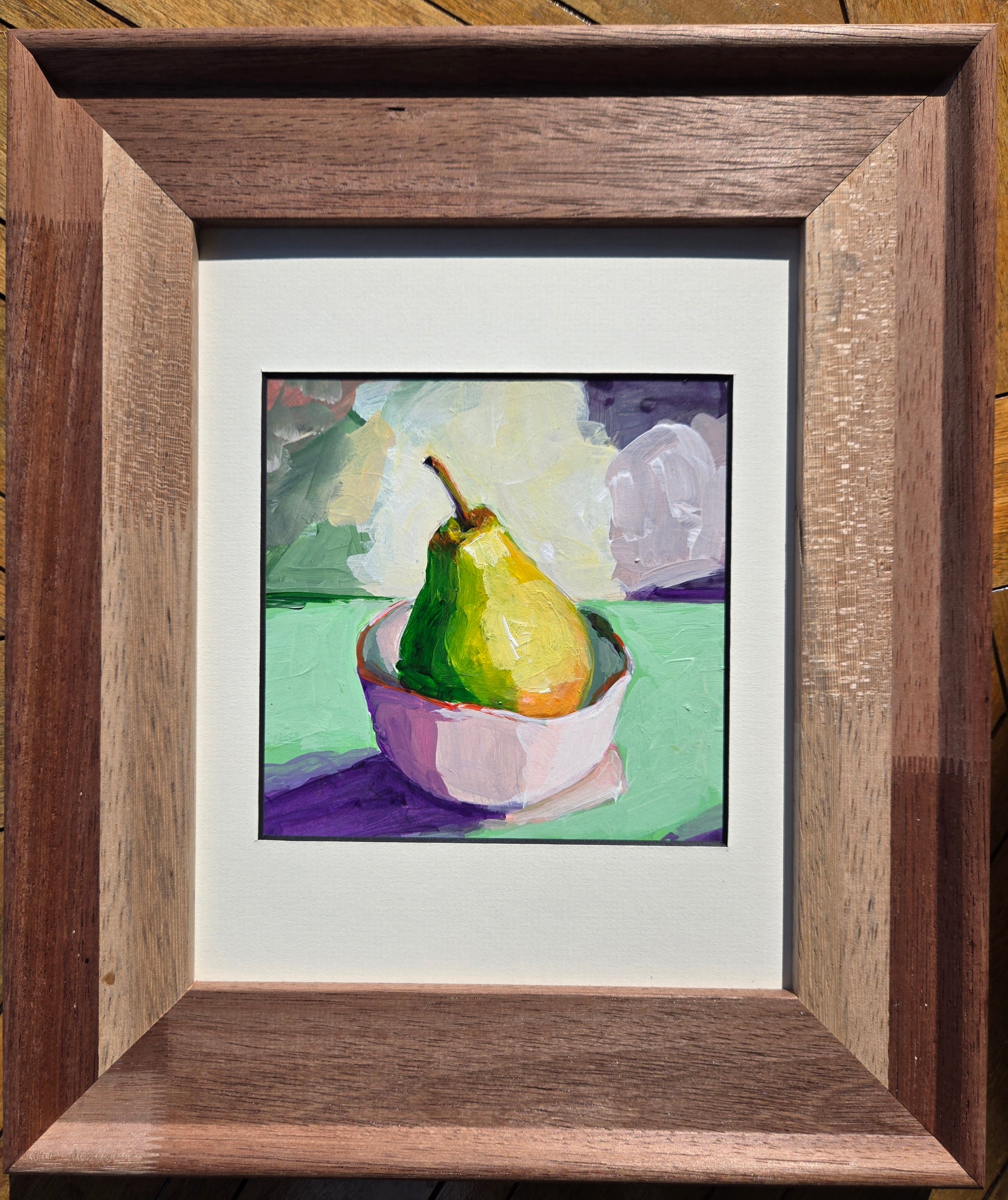 Pear Original Painting, Pear in A Bowl, Colorful Pear in Pink Bowl, titled: "Poire en Rose" Acrylic on 6x6 in Paper in 13x14 in Natural Frame with creme matt
